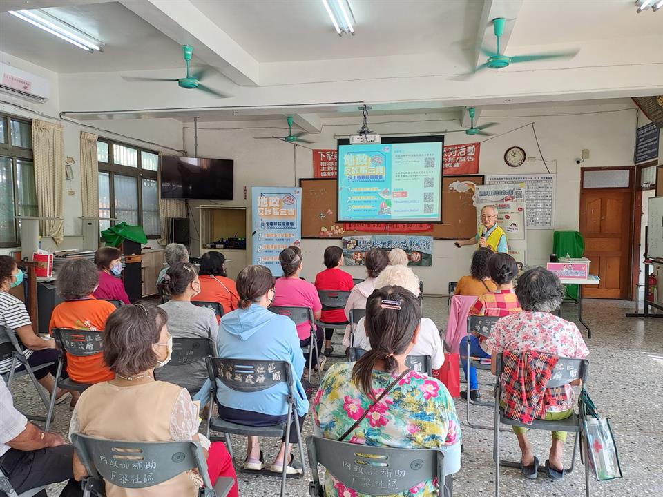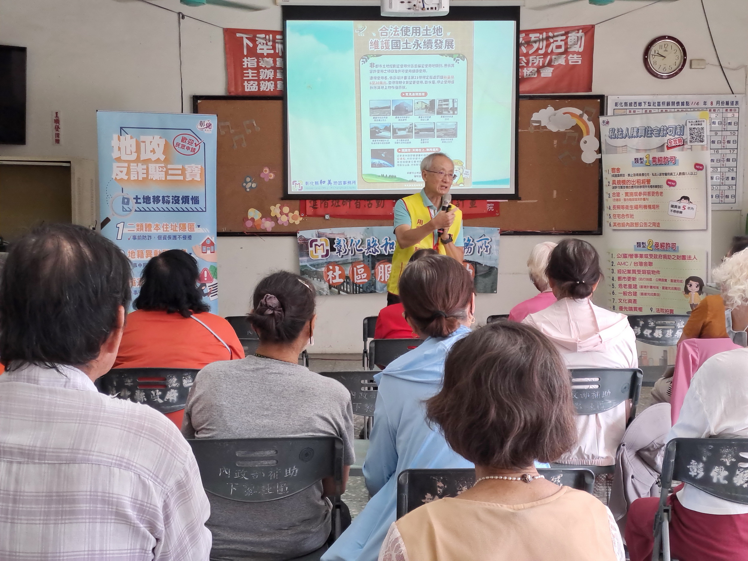新聞焦點 線西鄉下犁社區—地政業務宣導 發布日期 2025/10/01~2026/11/01 | 發佈單位: 地政處地籍科 | 發佈日期: 胡尹瑄 7531513 | 更新日期 2025/10/01 | 瀏覽人數: 14人 和美地政事務所於114年9月24日上午至彰化縣線西鄉下犁社區活動中心舉辦社區服務及宣導地政業務,推廣防詐地政三寶、宣講非都市土地使用管制之現行作法與行政機關作業思維,並解答在場民眾提問土地使用之疑惑。 下犁社區發展協會特別於社區年長者團康課程安排時段,讓和美地政事務所服務團隊宣導現行非都市土地管制作為及推廣地政防詐三寶作法,當日約有近20位民眾參與,由和美地政事務所服務團隊推廣地政防詐三寶—地籍異動即時通、第二類謄本地址隱匿、指定公文書送達處所,透過家人親友的互相關心來遏阻詐騙,藉由這些措施,以多重保護的方式,協力保障自身產權。另對於現行非都市土地違規使用的態樣予以說明,並說明中央行政、監察單位的處理思維,目前運用衛星影像定期搜查土地變異點的科技執法,地方政府執行層面經驗分享。另介紹和美地政事務所全功能櫃臺與中午服務不打烊的服務內容,讓鄉親可以更方便的洽辦事務。 和美地政事務所王建山主任表示,有鑑於詐騙事件層出不窮,因此將地政的阻詐措施介紹讓民眾知悉,提高民眾的防詐意識,並讓民眾對於土地使用管制的政府作為建立概念,期使和美地政事務所就權責執掌業務盡一份心力,並使各項業務及為民服務品質更加精進。 業務單位:和美地政事務所 聯 絡 人:林猷傑 電 話:7552217分機201