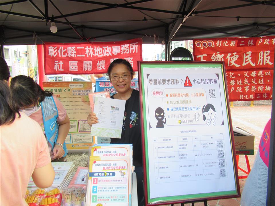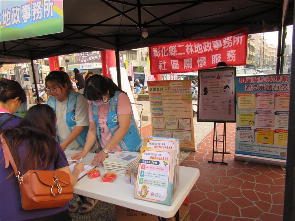 新聞焦點 二林地政參與「2025二林文化季-龍情薏舞蛇來幸福」藝術活動日,與民同樂宣導 發布日期 2025/10/02~2026/10/02 | 發佈單位: 地政處地籍科 | 發佈日期: 柯麗鳳 分機1510 | 更新日期 2025/10/02 | 瀏覽人數: 30人 為強化地政常識宣傳,二林地政事務所於27日(六)晚間,參與二林鎮圖書館廣場舉辦的「二林文化季-2025龍情薏舞蛇來幸福」系列活動,當晚進行「藝術活動日暨優良教師表揚」,除了表揚各校資深及優良教師外,還有二林各校、社區團體精彩表演,並有書畫絹扇、美食、手工DIY及遊戲闖關等攤位,吸引大批民眾參與。 當晚由該所林素惠及施滄明課長帶領同仁擺設宣導攤位,推廣轄區土地以航照套繪地籍圖(對位/各管位置)地政創新服務,宣導性別平權、節約能源、實價登錄、租賃住宅(防詐)、地籍圖重測及地籍異動即時通杜防詐騙等地政常識,同時邀請民眾追蹤、訂閱二林地政及地政處臉書粉絲團及影片,互動相當熱絡。 二林地政劉志宏主任表示,二林文化季是二林鎮的年度文化盛事,該所每年均會參與,利用宣導攤位與民眾互動,將最新最便民的地政新知,推廣給民眾瞭解並運用,並透過參與在地活動,與社區建立緊密的聯繫,讓地政成為民眾的好鄰居。 業務單位:彰化縣二林地政事務所 聯 絡 人:吳小姐 聯絡電話:04-8964793#207