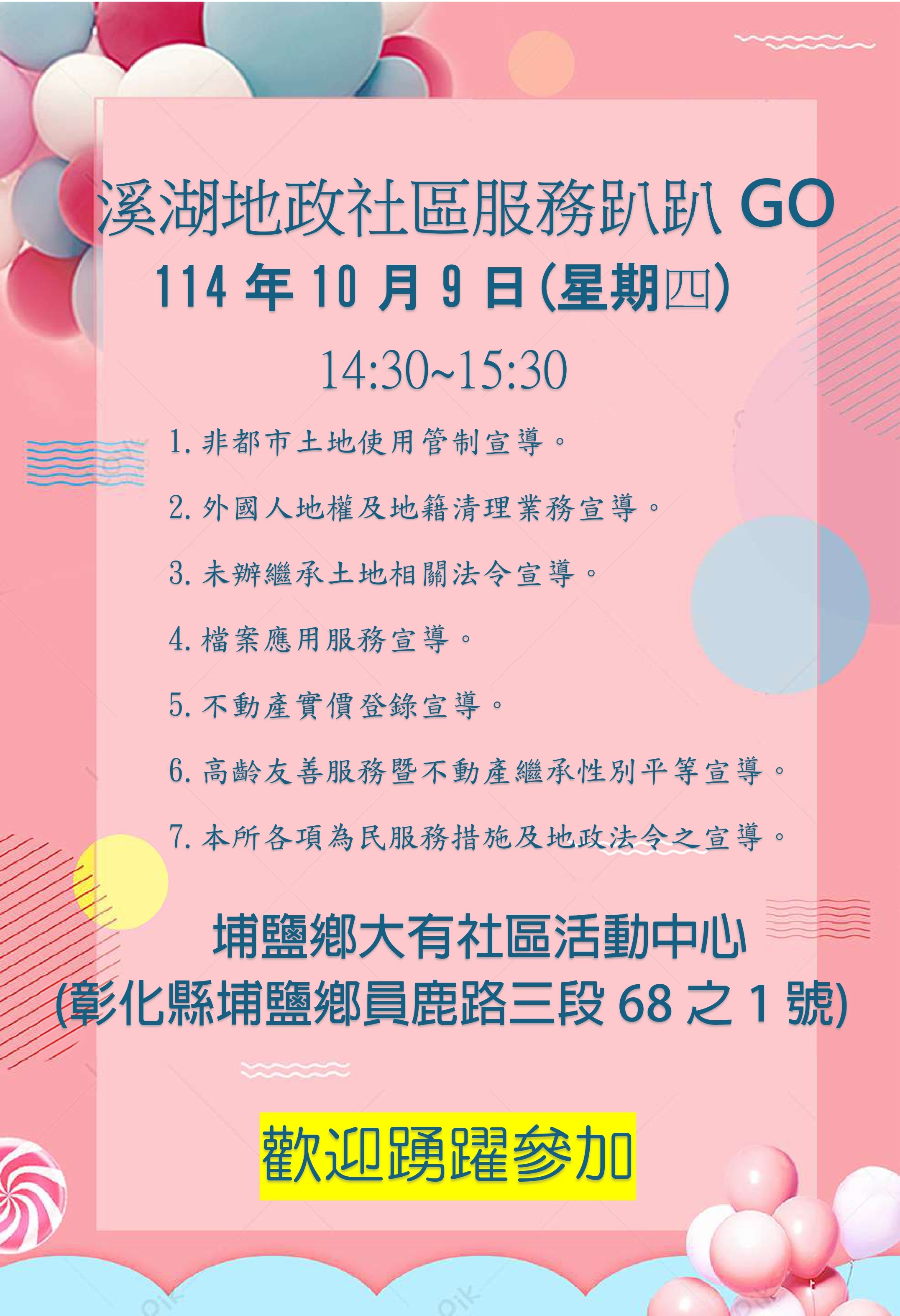 新聞焦點 溪湖地政10月9日於太平社區活動中心辦理「地政服務趴趴GO」,歡迎蒞臨參加! 發布日期 2025/10/03~2026/10/03 | 發佈單位: 地政處地籍科 | 發佈日期: 柯麗鳳 分機1510 | 更新日期 2025/10/03 | 瀏覽人數: 9人 溪湖地政事務所為主動接近民眾、深入社區瞭解民意並擴大服務層面,訂於114年10月9日(星期四)下午2時30分至3時30分於埔鹽鄉大有社區活動中心(彰化縣埔鹽鄉員鹿路三段68之1號)舉辦「地政服務趴趴GO」,竭誠歡迎鄉親前往諮詢土地登記、測量及地價相關問題。 地政方面的知識對於鄉親來說較為艱深複雜,因此該所特地深入社區,為民眾提供未辦繼承、地籍清理、外國人或大陸人取得不動產等相關法令解說。溪湖地政黃麗卿主任表示,藉由地政服務趴趴GO宣導當前施行之土地政策,如私法人買受住宅許可制、地籍異動即時通、不動產移轉登記性別平權等,期待能讓鄉親獲知有關地政常識,進而保障自身權益。當天該所準備多份文宣及精美紀念品發送,歡迎鄉親踴躍前往參與。 業務單位:溪湖地政事務所 聯 絡 人:林先生 電 話:8813119#315