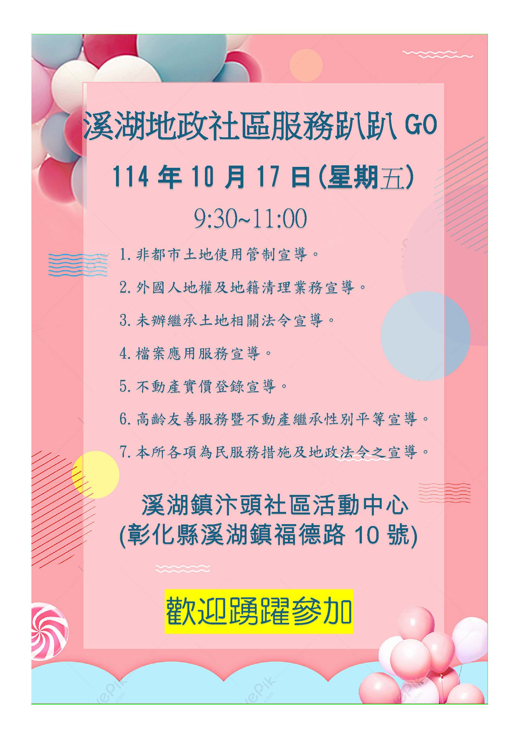 新聞焦點 溪湖地政10月17日於汴頭社區活動中心辦理「地政服務趴趴GO」,歡迎蒞臨參加! 發布日期 2025/10/17~2026/10/17 | 發佈單位: 地政處地籍科 | 發佈日期: 柯麗鳳 分機1510 | 更新日期 2025/10/17 | 瀏覽人數: 12人 溪湖地政事務所為主動接近民眾、深入社區瞭解民意並擴大服務層面,訂於114年10月17日(星期五)上午9時30分至11時於溪湖鎮汴頭社區活動中心(彰化縣溪湖鎮福德路10號)舉辦「地政服務趴趴GO」,竭誠歡迎鄉親前往諮詢土地登記、測量及地價相關問題。 地政方面的知識對於鄉親來說較為艱深複雜,因此該所特地深入社區,為民眾提供未辦繼承、地籍清理、實價登錄、外國人或大陸人取得不動產等相關法令解說及防詐宣導。溪湖地政黃麗卿主任表示,藉由地政服務趴趴GO宣導當前施行之土地政策,如私法人買受住宅許可制、地籍異動即時通、不動產移轉登記性別平權等,期待能讓鄉親獲知有關地政常識,進而保障自身權益。當天地所準備多份文宣及精美紀念品發送,歡迎鄉親踴躍前往參與。 業務單位:溪湖地政事務所 聯 絡 人:施先生 電 話:8813119#104