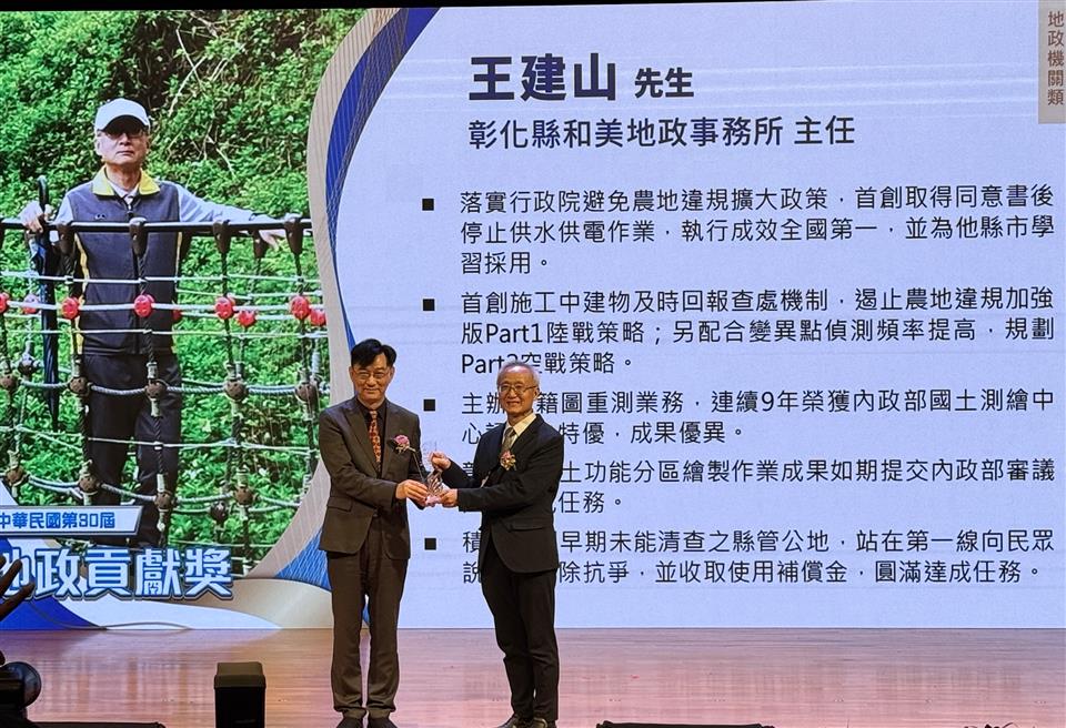 新聞焦點 賀~王建山主任榮獲第30屆地政貢獻獎 發布日期 2025/11/17~2026/11/17 | 發佈單位: 地政處地籍科 | 發佈日期: 柯麗鳳 分機1510 | 更新日期 2025/11/17 | 瀏覽人數: 22人 內政部於114年11月11日上午在公務人力發展學院福華國際文教會館2樓卓越堂舉辦「114年地政節慶祝大會」,表揚績優地政機關及人員,和美地政王建山主任因傑出優異的表現,獲得內政部地政司肯定,榮獲第30屆地政貢獻獎,並接受內政部政務次長董建宏頒獎表揚。 內政部自民國85年起由各地政機關、行政機關、學術團體及社會團體中,選拔傑出優秀人士,頒給地政貢獻獎,並於地政節慶祝活動公開表揚,該獎項至今已歷30載,本次和美地政王建山主任適逢第30屆。王主任因落實行政院避免農地違規擴大政策,首創取得同意書後停止供水電作業,執行成效全國第一,並為他縣市學習;規劃全國首創施工中建物及時回報查處機制,遏止農地違規加強版Part1陸戰,另配合衛星即時影像變異點資訊及時找到施工中違規建物加強版Part2空戰策略,執行期間帶領同仁到施工現場說明宣導及裁處,勇於任事不畏惡勢力之精神,為地政同仁學習之楷模;曾於地政事務所擔任地籍圖重測業務主辦長達9年內政部考核皆為特優等各項優良事蹟獲獎。 王主任服務於地政機關已達27年,經歷地權、地用、地籍圖重測、土地重劃、土地登記及國土計畫等各階段所負業務皆盡職積極精進革新,面對民意勇於接受挑戰,是後進地政人員學習的良好楷模! 業務單位:彰化縣和美地政事務所 聯 絡 人:陳小姐 電 話:7552217#305