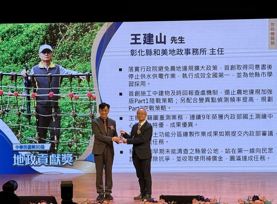新聞焦點 彰化縣地政團隊榮獲5大獎項 深獲內政部肯定! 發布日期 2025/12/01~2025/12/28 | 發佈單位: 地政處 | 發佈日期: 地政處 7222151 | 更新日期 2025/11/28 | 瀏覽人數: 33人 《置頂》 彰化縣政府地政處榮獲內政部114年對縣(市)政府地政業務督導考評「縣(市)組地政業務總考評績優獎」、「113年地籍圖重測考評優等獎」、「113年圖解數化地籍圖整合建置及都市計畫地形圖套疊考評優等獎」、「直轄市、縣(市)政府不動產阻詐成效績優獎」及和美地政事務所王建山主任榮膺中華民國第30屆「地政貢獻獎」等5大獎。彰化縣長王惠美於11月底擴大主管會報中表揚,並鼓勵同仁再接再厲,為民眾提供更優質的地政服務。 地政處表示,地政業務為地方建設及民眾安居的根基,本縣地政團隊積極推出20項年度創新,以提升整體服務品質,其中,「反詐騙2.0防護升級實施計畫—共同守護財產安全」,從事前預防、事中警示到事後追蹤,全面提升不動產交易的安全防線;「測量資訊系統化 成果共享爭議少」透過測量檔案整合與共享,有效提升作業效率並降低鑑界錯誤率,增進民眾信賴;亦持續推動18項服務優化與創新擴散措施,擴及服務民眾觸及面,例如:「預售備查抵叨位 乎我來報你知」結合Google Maps平台,建置「彰化縣預售屋地圖」,協助民眾即時掌握預售屋資訊;「土地財產健檢揪感心」方案更擴大實施至各地政事務所,透過貼心服務展現地政團隊對社會的關懷與責任,深獲內政部考評委員及長官肯定。 今年本縣地政團隊榮獲5大獎項肯定,充分展現了努力打拼的豐碩成果與奉獻精神。未來地政團隊將持續肩負起土地管理與保障民眾權益的責任,秉持為民服務的初心和與時俱進的工作態度,積極推動創新與便民措施,共同打造美好彰化幸福城市的願景,邁向永續發展的未來。
