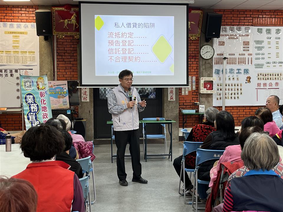 新聞焦點 彰化地政前進秀水鄉馬興社區 感謝村長及村民熱情參與 發布日期 2025/12/01~2026/11/28 | 發佈單位: 地政處地籍科 | 發佈日期: 柯麗鳳 分機1510 | 更新日期 2025/12/01 | 瀏覽人數: 16人 為讓地政服務走進鄉親的心、提升民眾防詐意識,彰化地政事務所地政宣導團26日前進秀水鄉馬興社區,舉辦「地政與生活-地政常識與生活保障」宣導課程,以口語化的講解與貼近生活的資訊作為課程主軸,讓村民更了解日常生活中與地政相關的重要事項,也展現地政團隊主動關懷社區的服務精神。 課程中,陳易宏主任以生動活潑的方式提醒村民,近年詐騙集團常以「好麻吉」手法博取信任,先與受害者稱兄道弟,再大力推薦所謂「投資好標的」。若被害人手頭資金不足,詐騙集團還會介紹「借款人」及「合作代書」,形成一套完整的詐騙鏈。陳主任提醒鄉親務必提高警覺,「千萬莫貪」,若有投資或借貸需求,一定要透過正當管道,並以銀行借貸為最安全方式,避免落入詐騙陷阱。此外,由於此次課程多由女性長者參與,陳主任特別叮嚀大家回家後務必與家人分享「地籍異動即時通」及「指定送達處所」等服務,若有時間也可至就近地政事務所申請,為自家房產多添一層保障。 活動最後,彰化地政事務所陳易宏主任特別感謝秀水鄉馬興村陳明灶村長的全程熱情參與,不僅積極協助社區動員,更提供優質的場地與環境,讓地政宣導團能在友善的氛圍中與村民交流。主任表示,未來將持續走入社區,透過寓教於樂的方式推廣地政知識,守護民眾的財產安全。 務單位:彰化縣彰化地政事務所 聯 絡 人:陳小姐 電 話:7222612#406