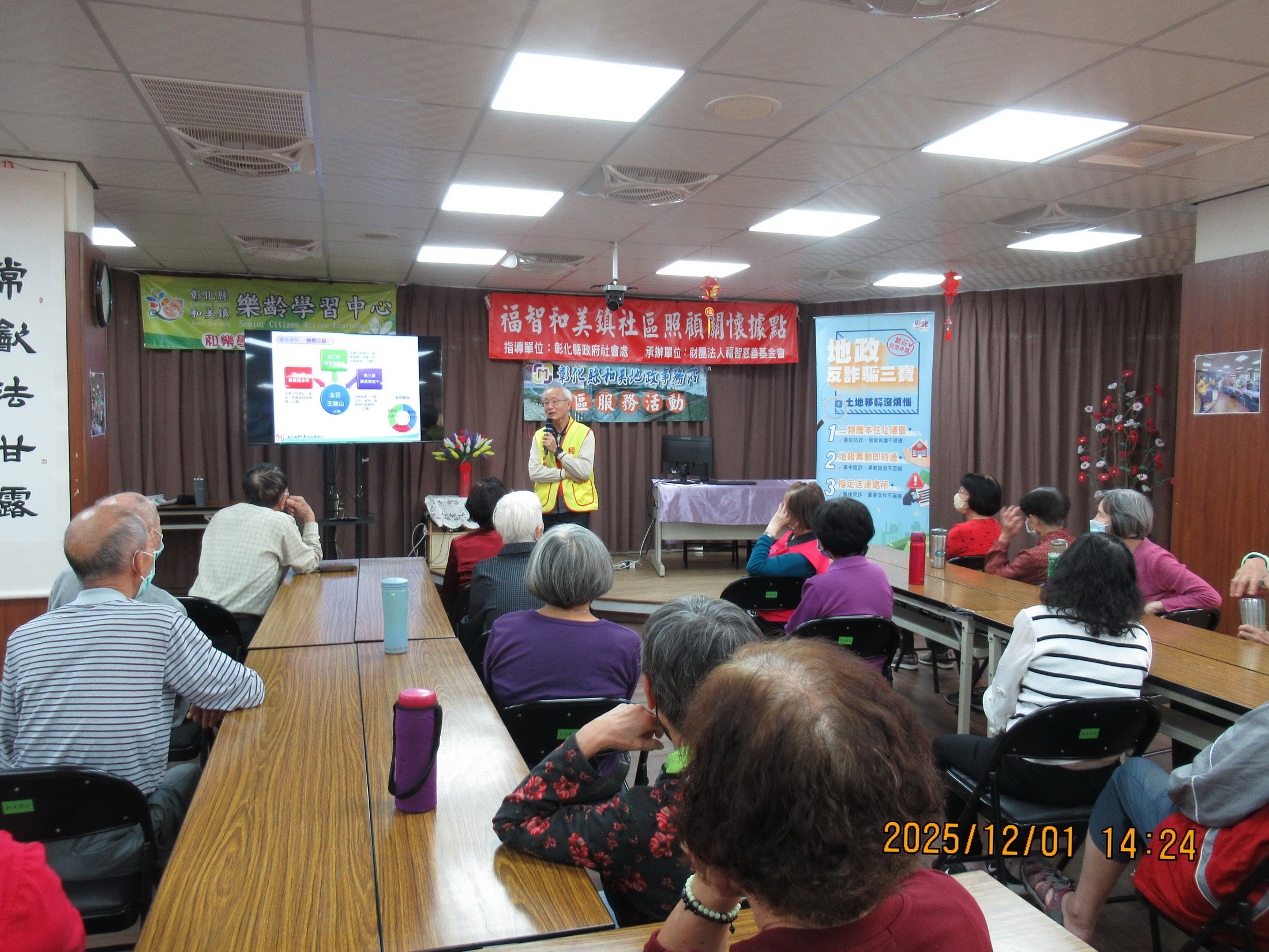 新聞焦點 和美地政宣導如何避免房產被詐,宣導成果佳 發布日期 2025/12/04~2026/12/03 | 發佈單位: 地政處地籍科 | 發佈日期: 柯麗鳳 分機1510 | 更新日期 2025/12/03 | 瀏覽人數: 13人 近來詐騙案層出不窮,尤其是房產詐騙,也有增加趨勢,為宣導民眾對土地投資詐騙、土地繼承權利等地政業務,和美地政於114年12月1日(星期一)下午2-4時,前往福智慈善基金會德美中心辦理房產防詐及地政業務宣導,該中心參與志工及鄉親都非常歡迎,活動順利完成。 因為目前社會上地面師詐騙案件層出不窮,為防範房產詐騙案件,降低私人借貸間的風險,並推廣本縣所設計地政防詐騙三寶,鼓勵鄉親辦理「地籍異動即時通」以防詐騙,因此本次宣導解說內政部及縣府製作如何防詐騙方法圖卡,教導長者如何避免被騙,另外也對地所地政業務進行介紹;而部分民眾對土地變更議題頗感興趣,主講人王建山主任也以在縣府辦理實務經驗,分別回答了民眾的提問。 該所王建山主任表示,地政工作與民眾財產安全息息相關,可以說是民眾財產守護員,地政防詐三寶「地籍異動即時通」、「住址隱匿」、「指定送達處所」能降低不動產詐騙事件發生;透過社區服務的直接宣導方式,讓每位民眾都能清楚辨識詐騙手段,學會如何防範,確保自己的土地權益不受侵害,並藉由直接溝通的方式,可以讓民眾快速認識地政業務。因此持續積極深入社區直接面對民眾,以淺顯易懂方式宣講讓長者了解,成為民眾財產守門員並提供鄉親更多元的服務,將為地政人員之職責。 業務單位:和美地政事務所 聯 絡 人:蔡小姐 電 話:7552217#103
