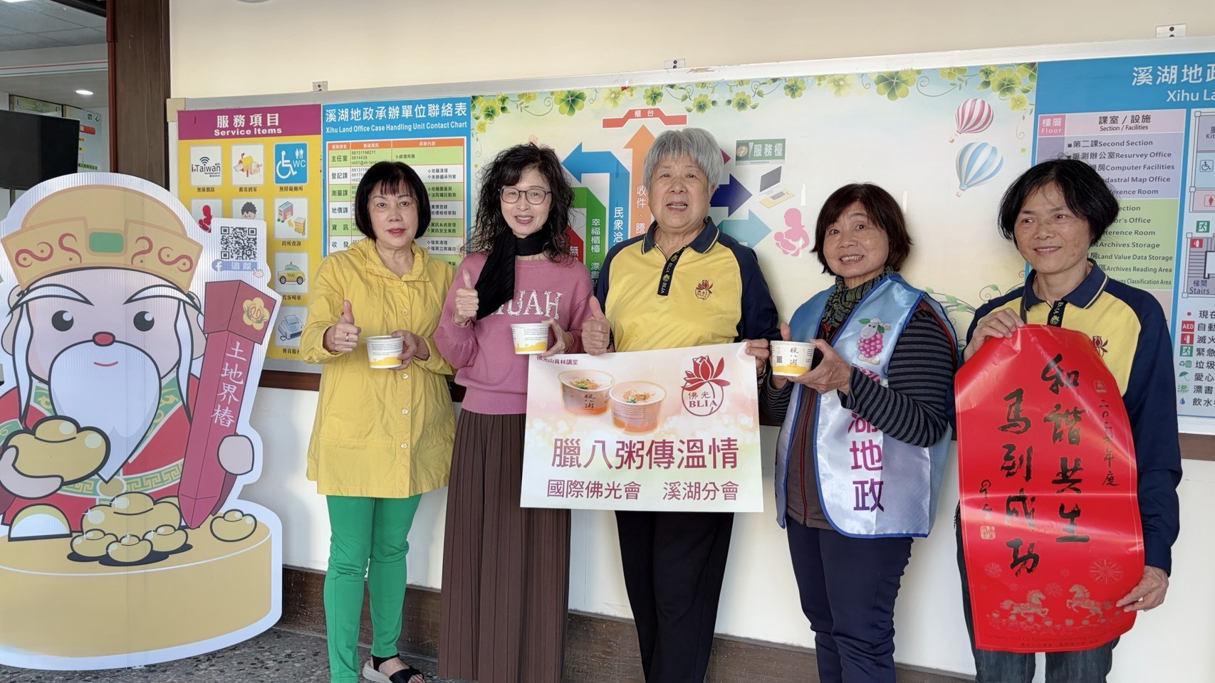 新聞焦點 一碗臘八粥傳遞祝福,佛光會攜手溪湖地政迎向和諧新年 發布日期 2026/01/23~2027/01/21 | 發佈單位: 地政處地籍科 | 發佈日期: 柯麗鳳 分機1510 | 更新日期 2026/01/23 | 瀏覽人數: 8人 為迎接臘八佳節並傳遞新春祝福,國際佛光會溪湖分會近日蒞臨溪湖地政事務所,辦理「臘八粥傳溫情」公益關懷活動,致贈精心熬煮的臘八粥,並同時致送星雲大師一筆字墨寶2026年春聯「和諧共生・馬到成功」,向第一線服務同仁及洽公民眾傳達關懷與祝福,讓寒冬中增添濃濃暖意。 國際佛光會溪湖分會長年投入社會公益與文化推廣,每逢臘八節即發起臘八粥結緣活動,廣結善緣。今年特別結合新春將至,除臘八粥外,亦致贈象徵祝福與吉祥的星雲大師一筆字春聯,期盼以「和諧共生」的理念,祝福社會祥和、政務推展順遂,「馬到成功」迎向嶄新的一年。 溪湖地政事務所黃麗卿主任表示,地政業務與民眾權益息息相關,同仁長期肩負繁重行政與服務工作,國際佛光會在歲末寒冬之際前來關懷,除暖胃更暖心,讓同仁深受感動,也感受到民間團體對公務服務的支持與肯定。 業務單位:溪湖地政事務所 聯 絡 人:吳小姐 電 話:8813119#204