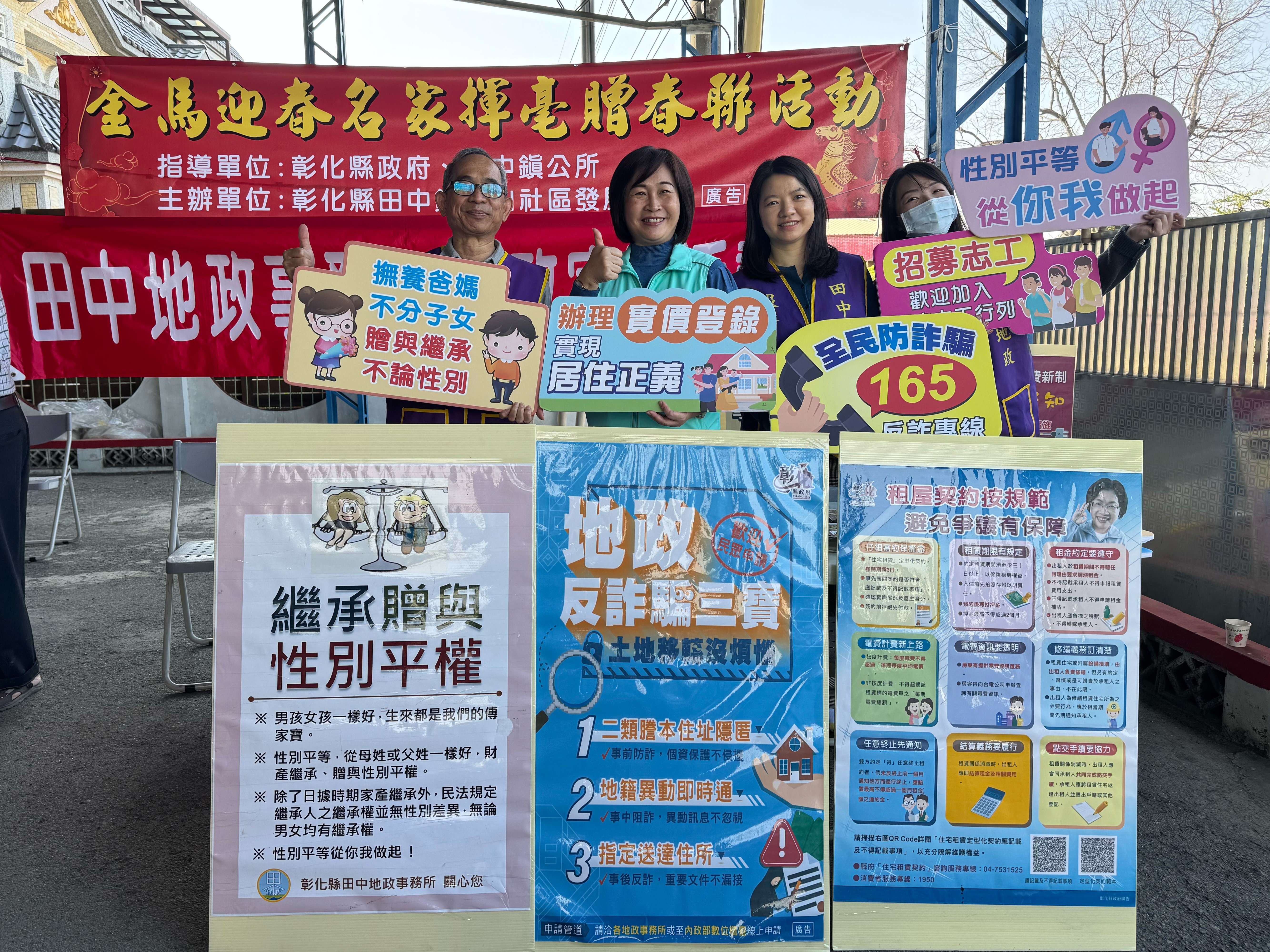 新聞焦點 田中地政走入社區迎新春,名家揮毫贈春聯,地政宣導暖人心 發布日期 2026/01/29~2027/01/29 | 發佈單位: 地政處地籍科 | 發佈日期: 柯麗鳳 分機1510 | 更新日期 2026/01/29 | 瀏覽人數: 54人 農曆新年將近,為與鄉親一同迎接新春佳節,田中地政於1月25日配合香山社區「金馬迎春名家揮毫贈春聯活動」辦理地政業務宣導,在墨香與年味交織的熱鬧氛圍中,拉近與民眾的距離,互動交流,傳遞地政資訊,並提前向大家拜早年,祝福鄉親新年快樂、萬事如意。 活動現場邀請逸東書法社的書法老師現場揮毫,一副副充滿祝福的春聯送到民眾手中,象徵新年的好彩頭。田中地政也於活動中設攤,向鄉親宣導不動產實價登錄,提醒大家在買賣不動產時要留意交易資訊,維護市場透明與自身權益;同時推廣內政部建置的「租金查詢平台」,協助民眾了解合理租金行情,保障租賃雙方權益。亦於活動中宣導性別平等觀念,強調不動產權利不分性別皆應受到保障,同時加強民眾預防不動產詐騙之觀念,呼籲民眾提高警覺,遇有疑慮可撥打165反詐騙專線查證。 田中地政事務所劉玉株主任表示,透過社區節慶活動,讓地政業務走進民眾生活,提供即時正確的地政資訊給鄉親。新的一年,該所也將持續陪伴鄉親,提供貼心、專業的服務,與大家一起迎向平安、幸福的金馬年。 業務單位:彰化縣田中地政事務所 聯 絡 人:過小姐 電 話:04-8742622