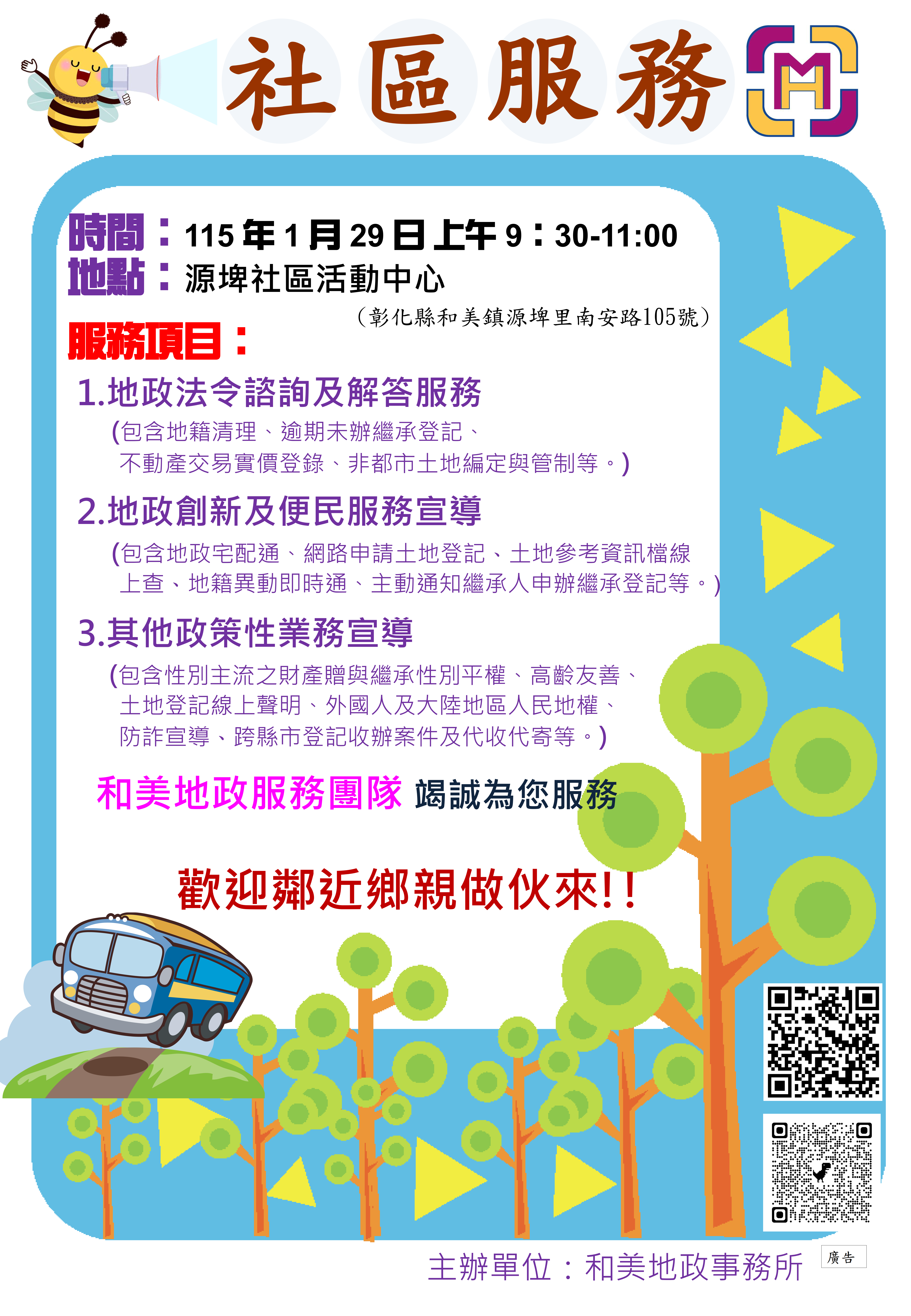 新聞焦點 和美地政1月29日在和美鎮源埤社區活動中心辦理服務~歡迎鄉親前來聆聽 發布日期 2026/01/29~2027/01/29 | 發佈單位: 地政處地籍科 | 發佈日期: 柯麗鳳 分機1510 | 更新日期 2026/01/29 | 瀏覽人數: 32人 為主動服務民眾、深入社區瞭解民眾需求,和美地政事務訂於115年1月29日(星期四)上午9時30分至11時前往源埤社區活動中心辦理社區宣導服務,歡迎鄉親蒞臨諮詢地政疑義。近來不動產詐騙案件層出不窮,本次宣導將協助了解不動產相關詐騙資訊,教導民眾如何防止被詐騙,現場除提供地政法令諮詢、地政業務介紹外,並有如何避免房產被詐的防詐宣導EDM及各項便民服務措施宣導文宣,提供民眾索取。 本次由該所王建山主任主講,特別選定與生活息息相關的「反詐騙宣導」、「土地財產繼承-性別平權」、「農地不違規使用」、「實價登錄」、「土地鑑界與分割」、「國土測繪土資系統」等地政常識加以宣導與介紹。 和美地政王建山主任表示,近來房產詐騙頻繁而房產又是我們安居樂業的處所,若發現自己房產疑似被詐騙,除可隨時撥打165反詐騙專線尋求協助,也鼓勵民眾多參加該所舉辦社區宣導,透過地政服務團隊解說,提升自我防詐意識與觀念。 業務單位:彰化縣和美地政事務所 聯 絡 人:周小姐 電 話:7552217#104
