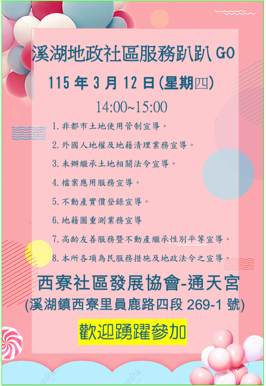 新聞焦點 溪湖地政3月12日於溪湖鎮通天宮辦理「地政服務趴趴GO」,歡迎蒞臨參加! 發布日期 2026/03/10~2027/03/06 | 發佈單位: 地政處地籍科 | 發佈日期: 柯麗鳳 分機1510 | 更新日期 2026/03/10 | 瀏覽人數: 23人 溪湖地政事務所為主動走入基層、貼近民眾需求,深入社區傾聽地方心聲並擴大為民服務層面,訂於115年3月12日(星期四)下午2時至3時,於溪湖鎮西寮社區發展協會—通天宮(溪湖鎮西寮里員鹿路四段269-1號)舉辦「地政服務趴趴GO」活動。現場將由專業同仁提供一對一諮詢服務,竭誠歡迎鄉親踴躍前往,就土地登記、土地測量、地價查詢及相關不動產問題提出疑問,獲得即時且正確的解答。 考量地政法令與實務程序涉及專業性較高,對長者或一般民眾而言較為艱深繁複,溪湖地政特別深入社區辦理宣導與說明,針對常見之未辦繼承登記、地籍清理作業、外國人或大陸地區人民取得不動產相關規定等議題,進行淺顯易懂的法令解析與實務說明,協助民眾釐清觀念、掌握辦理流程,避免因不熟悉規定而影響自身權益。 溪湖地政事務所黃麗卿主任表示,透過「地政服務趴趴GO」主動式服務模式,除提供法令諮詢外,也同步宣導當前重要土地政策與便民措施,包括私法人買受住宅許可制、地籍異動即時通服務、不動產移轉登記性別平權等政策重點,期盼讓民眾即時掌握最新制度與權益保障措施,提升地政知能與風險防範意識。 業務單位:溪湖地政事務所 聯 絡 人:楊先生 電 話:8813119#309