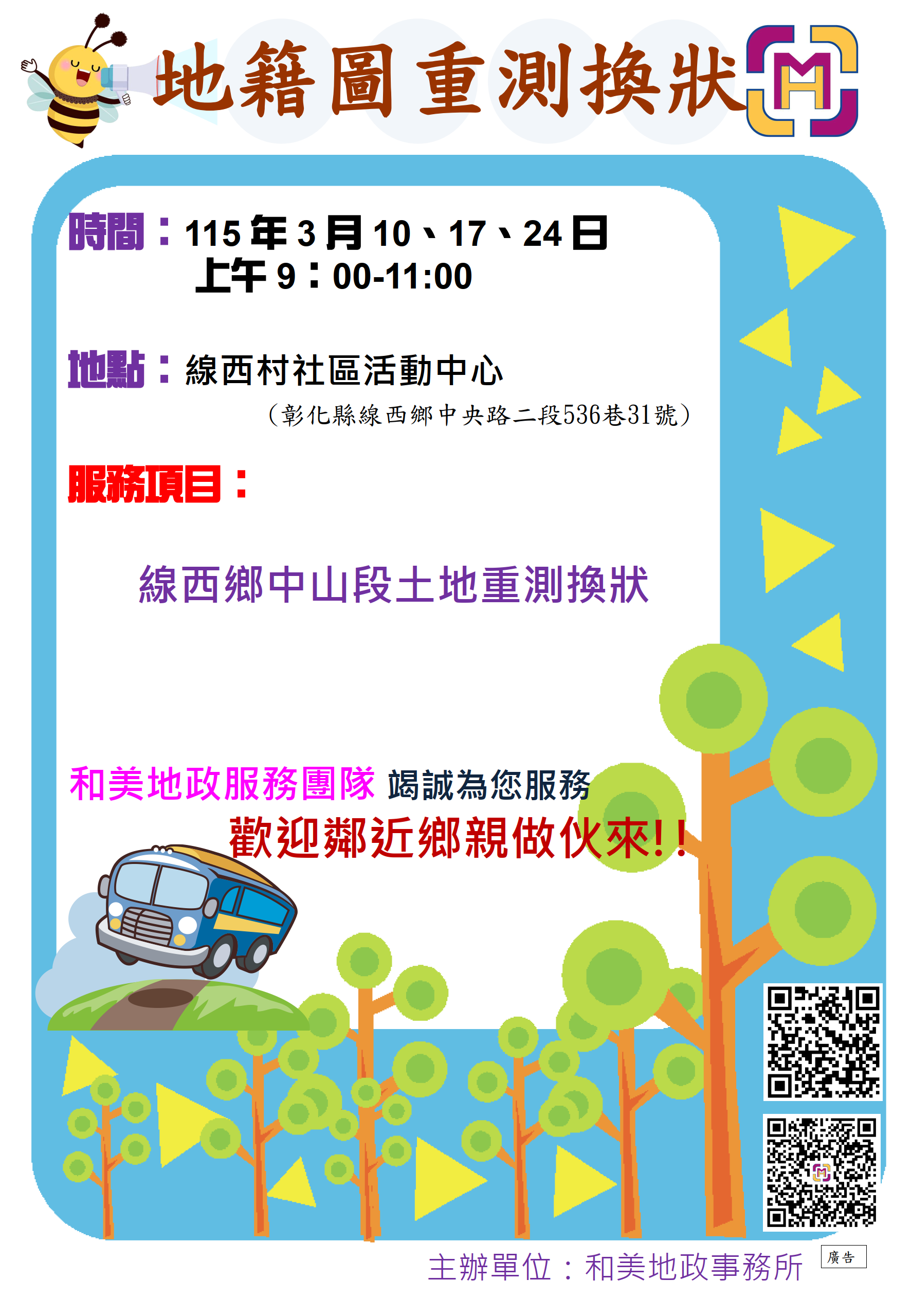新聞焦點 就近服務再升級 和美地政辦理地籍圖重測換狀作業 發布日期 2026/03/10~2027/03/09 | 發佈單位: 地政處地籍科 | 發佈日期: 柯麗鳳 分機1510 | 更新日期 2026/03/10 | 瀏覽人數: 28人 為方便民眾就近辦理換發權狀,和美地政事務所訂於3月10日、3月17日、3月24日,上午9時至11時,派員前往線西鄉線西村社區活動中心辦理地籍圖重測換狀作業,現場換發部分原重興段、德興段地段重測後為中山段所有權狀。 本次因辦理地籍圖重測作業,部分原重興段及德興段土地已重測,重測後地段名為中山段,相關公告、登記及繕狀作業均已完成,並陸續寄發領狀通知書,請土地所有權人依通知書所載時間,攜帶通知書、原土地所有權狀、身分證正本及印章,前往指定地點辦理換領新權狀。如民眾無法於通知書所載時間前往辦理,亦可於上班時間至和美地政事務所4號櫃檯補辦換領事宜。 和美地政事務所王建山主任表示,為減少鄉親往返奔波,本次特別安排至社區活動中心集中換狀,提醒收到地籍圖重測權狀領狀通知書的民眾,把握機會儘速辦理,以保障自身權益。民眾如有相關疑問,歡迎撥打電話(04)755-2217轉分機104洽詢。 業務單位:和美地政事務所 聯 絡 人:周小姐 電 話:7552217#104