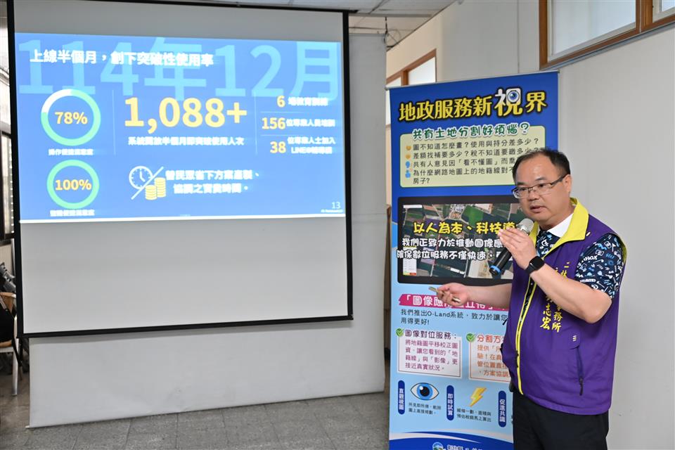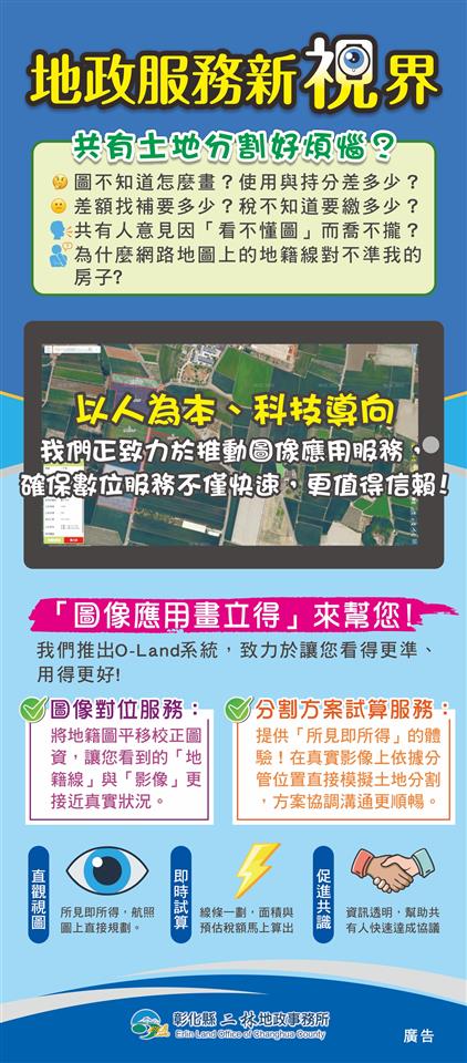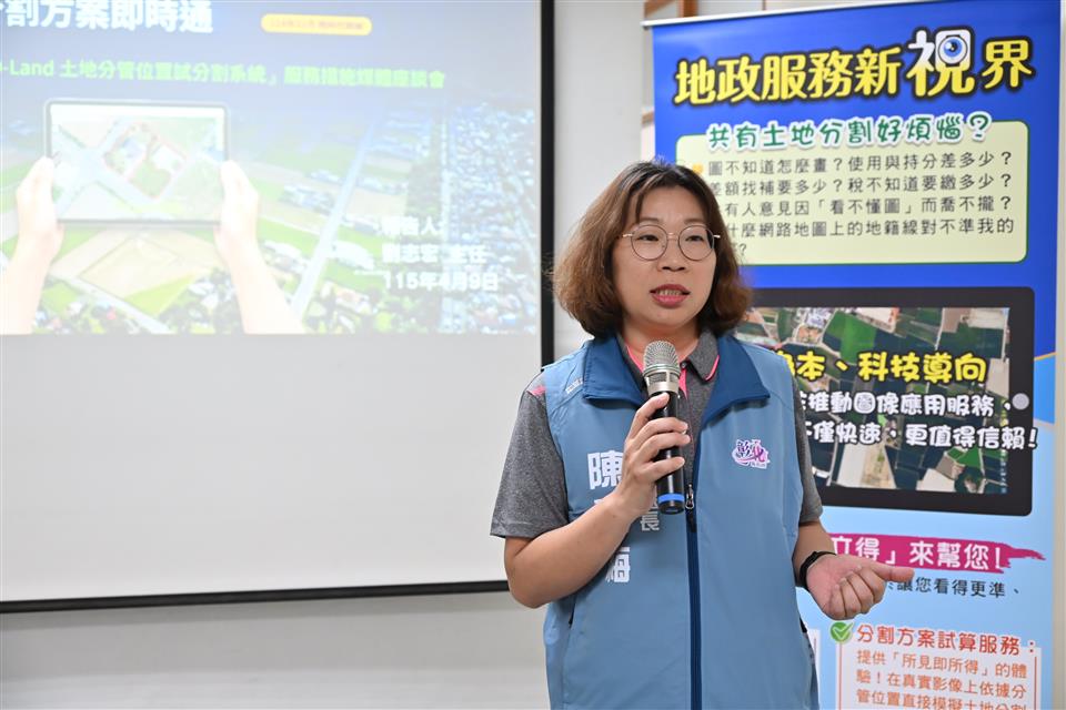 新聞焦點 地政服務新視界 分割方案即時通 二林地政首創「O-LAND土地分管位置試分割系統」 發布日期 2026/04/09~2027/04/09 | 發佈單位: 地政處 | 發佈日期: 許技士 7531576 | 更新日期 2026/04/09 | 瀏覽人數: 172人 為提升共有土地分割協調效率,彰化縣政府由二林地政事務所首創「O-LAND土地分管位置試分割系統」(https://www.ystcgis.com.tw/ng/),結合科技與地政專業,讓分割方案能以圖像化方式快速呈現,提升溝通與作業效率,並於114年12月試辦、115年1月正式上線。為說明此項創新服務與推動成果,彰化縣政府地政處於今(9)日在縣府6樓新聞處咖啡藝廊舉辦媒體座談會,由縣府地政處長陳麗梅代表彰化縣長王惠美與會,並邀集各地政事務所主管共同參與。 地政處長陳麗梅表示,由二林地政事務所全國首創的「O-LAND土地分管位置試分割系統」結合高精度的正射影像圖及地籍圖,讓民眾在辦理土地分管、土地位置試分割時,可以在真實影像上模擬分割位置,清楚對應房屋、道路與田埂等現地位置,達到「所見即所得」的效果。同時結合土地公告現值資料,提供土地增值稅試算功能,協助民眾在規劃分割方案時,同步掌握稅賦資訊。 地政處長陳麗梅指出,以往地籍圖多以幾何線條呈現,民眾難以與實際地形位置對照,容易影響共有土地分割的協調作業。「土地分管位置試分割系統」透過整合地籍圖與高解析度航照影像,將抽象資料轉化為直觀視覺資訊,讓分割方案「畫」立得,民眾只需透過電腦或手機,即可於航照影像上劃設分割線,清楚對應現地位置。系統並結合土地公告現值,提供增值稅試算功能,讓民眾可同步掌握稅賦資訊。 地政處表示,為擴大服務效益,二林地政事務所除建置系統外,也同步建立轄區地政士與不動產經紀人培訓,及設置LINE官方帳號提供即時操作諮詢服務機制,以利相關從業人員快速熟悉系統操作流程協助民眾辦理。自114年12月11日系統開辦以來,累計使用人次已突破2,800人次,使用者回饋良好,整體滿意度達100%。未來將推廣至各地政事務所並持續優化系統功能,透過科技加值推動智慧地政服務,提升行政效率與服務品質,並保障民眾土地產權權益。 與會貴賓還有地政處副處長何明修、二林地政事務所主任劉志宏、彰化地政事務所主任陳易宏、員林地政事務所主任蘇添旺、和美地政事務所主任王建山、鹿港地政事務所主任何雪霞、田中地政事務所主任劉玉株、北斗地政事務所主任陳春木、溪湖地政事務所主任黃麗卿等。