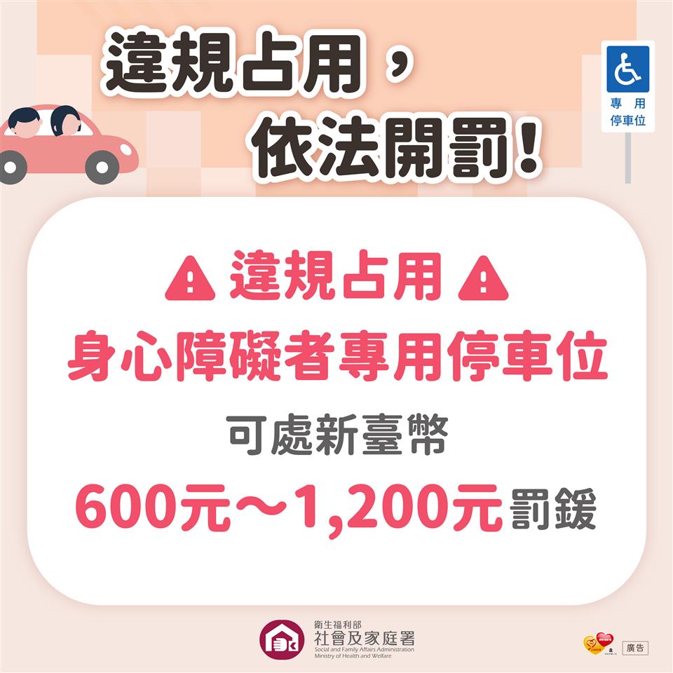 公告資訊 身心障礙專用停車位請勿違規佔用 發布日期 2025/10/07~2025/11/07 | 發佈單位: 地政處 | 發佈日期: 陳翊倫 7531515分機1515 | 更新日期 2025/10/07 | 瀏覽人數: 18人 請民眾不要違規占用專用停車位以免受罰