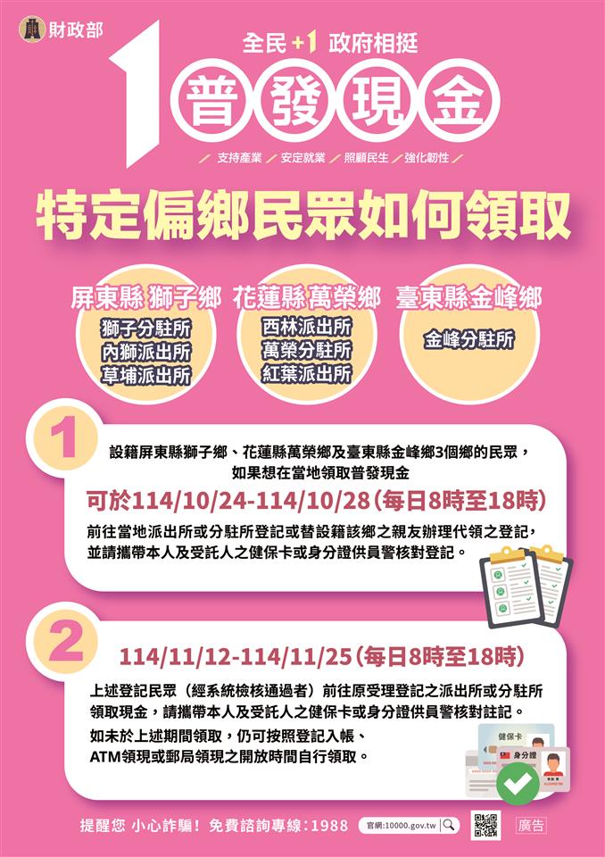 公告資訊 「全民+1 政府相挺」 發布日期 2025/11/06~2025/12/06 | 發佈單位: 地政處 | 發佈日期: 陳翊倫 7531515分機1515 | 更新日期 2025/11/06 | 瀏覽人數: 31人 財政部依「因應國際情勢強化經濟社會及民生國安韌性特別條例」辦理普發現金,發放現金每人新臺幣1萬元,並採「登記入帳」、「ATM領現」、「郵局領現」、「直接入帳」及「造冊發放」等5種方式,便利民眾領取。 普發現金廣宣網站網址為10000.gov.tw,並請民眾注意詐騙,如遇可疑電話或不明訊息請立即撥打165反詐騙專線。