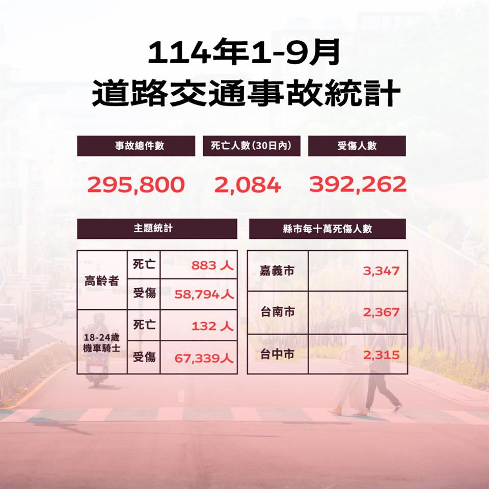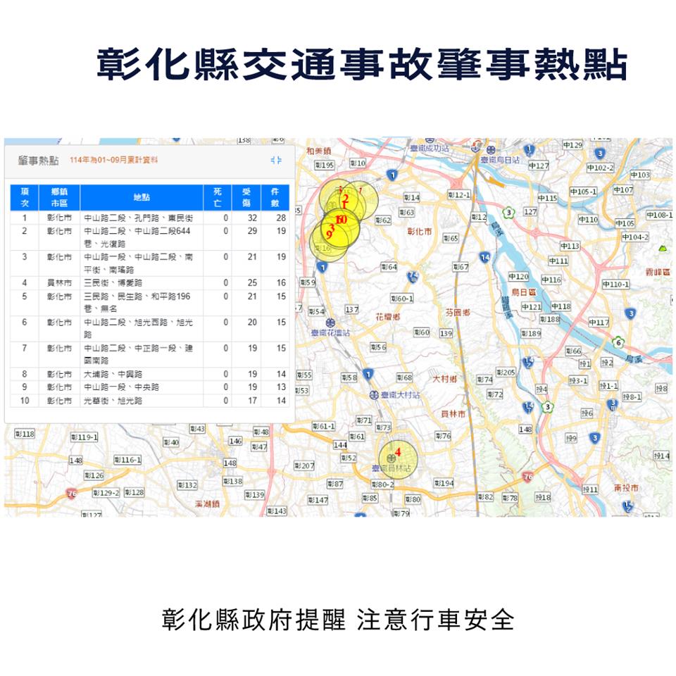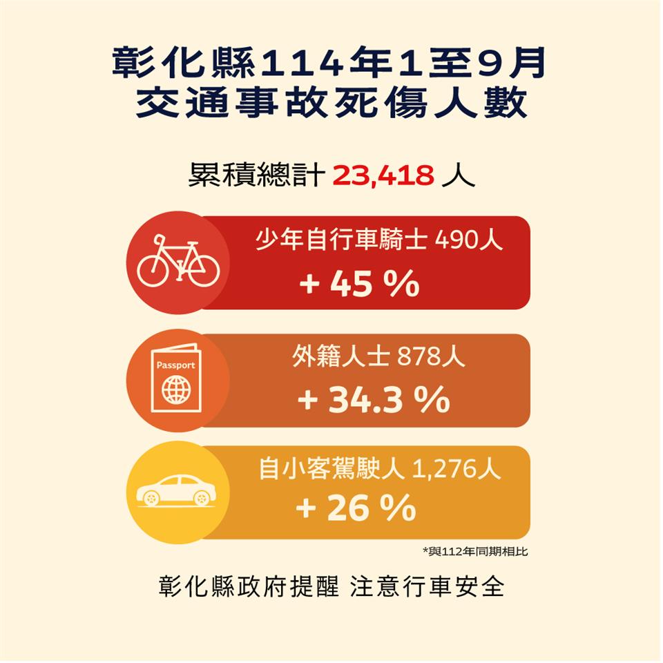 公告資訊 彰化縣114年1-9月道路交通事故死傷累計23,418人, 發布日期 2025/12/26~2026/01/26 | 發佈單位: 地政處 | 發佈日期: 陳翊倫 7531515分機1515 | 更新日期 2025/12/26 | 瀏覽人數: 10人 🟣分心騎車有風險,左轉停看更安全。 🟣At Unsignalized Intersections: Stop, Look, and Yield. 🟣多一分禮讓,少一分遺憾,路口不搶快,安全自然來!