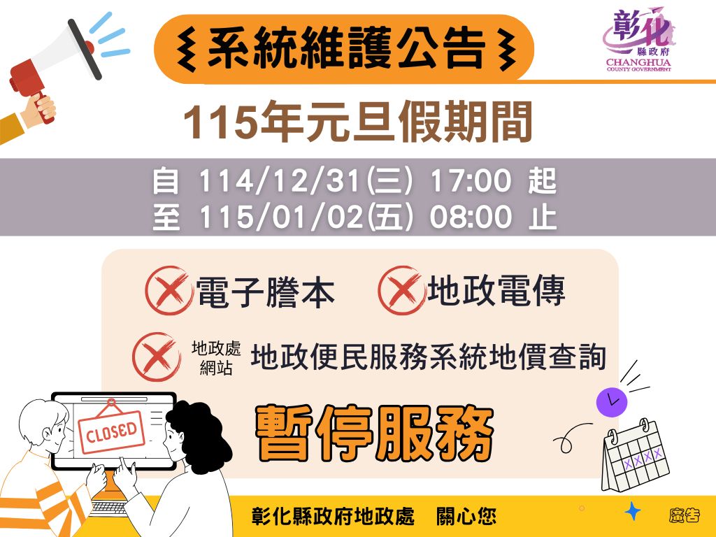 公告資訊 115年元旦假期服務時間公告 發布日期 2025/12/29~2026/01/02 | 發佈單位: 地政處 | 發佈日期: 陳翊倫 7531515分機1515 | 更新日期 2025/12/29 | 瀏覽人數: 21人 115年元旦假期各項服務時間調整如下: 電子謄本:114/12/31(三)17:00-115/1/2(五)08:00暫停服務。 地政電傳:114/12/31(三)17:00-115/1/2(五)08:00暫停服務。 地政便民服務系統地價查詢: 114/12/31(三)17:00-115/1/2(五)08:00暫停服務 請有需要的民眾多加留意。