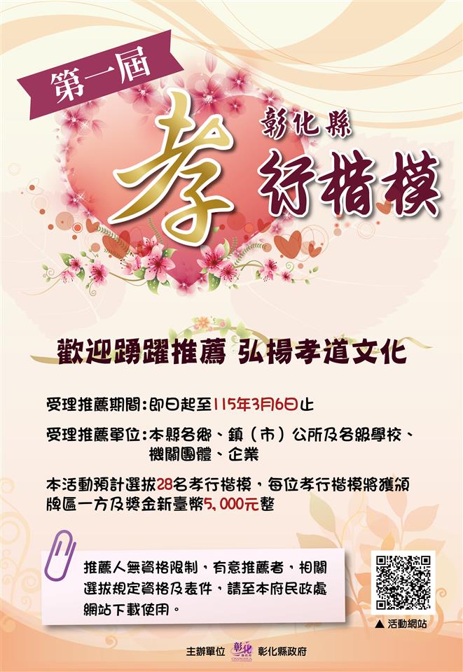 公告資訊 彰化縣115年孝行楷模選拔,歡迎踴躍推薦符合資格人員 歷史訊息 | 發布日期 2026/01/12~2026/02/12 | 發佈單位: 地政處 | 發佈日期: 陳翊倫 7531515分機1515 | 更新日期 2026/01/12 | 瀏覽人數: 61人 本縣辦理115年孝行楷模選拔,推薦人(一般民眾、村里長、社工人員、學校老師等)於115年3月6日前可向推薦單位(本縣各鄉(鎮、市)公所及各級學校、機關團體、企業)踴躍推薦符合資格人員