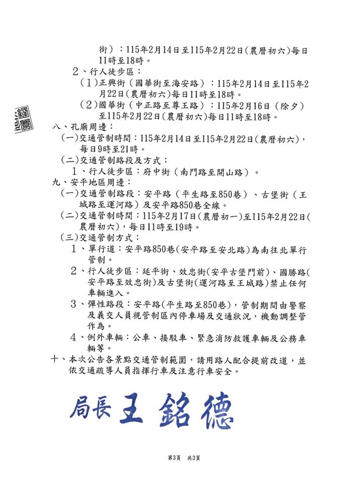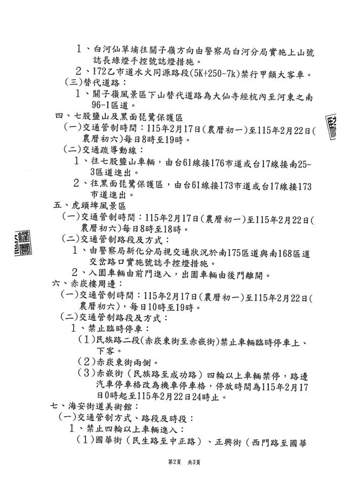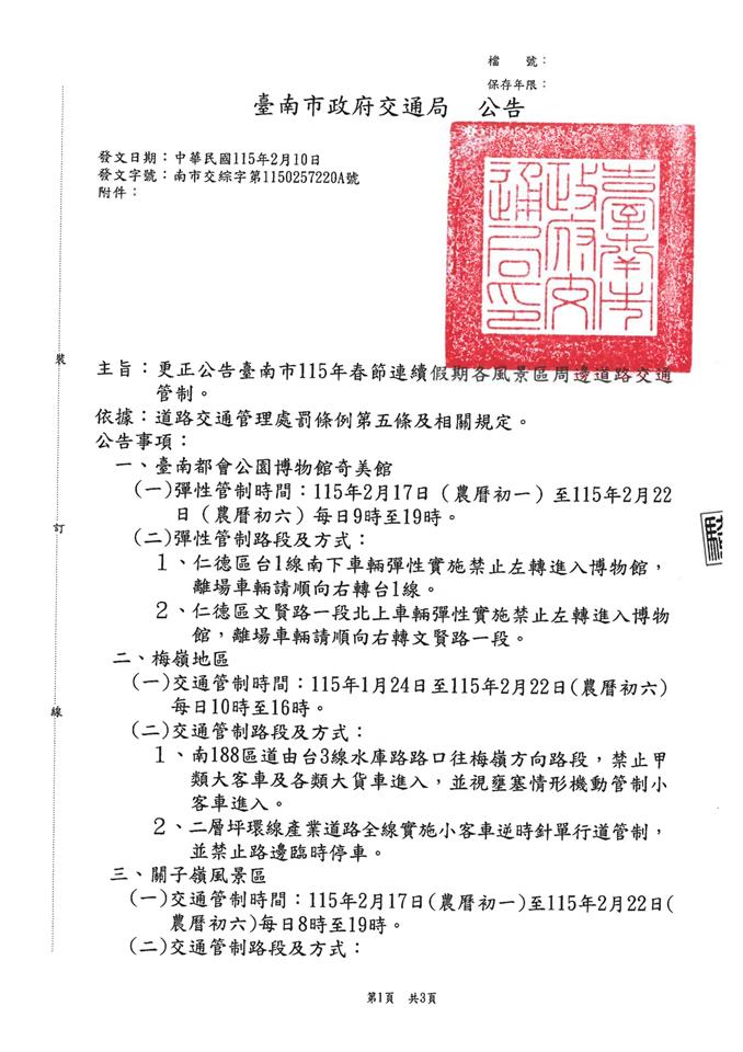 公告資訊 臺南市115年春節連續假期各風景區聯外道路交通管制更正公告,請民眾多加留意 發布日期 2026/02/13~2026/02/22 | 發佈單位: 地政處 | 發佈日期: 陳翊倫 7531515分機1515 | 更新日期 2026/02/13 | 瀏覽人數: 10人