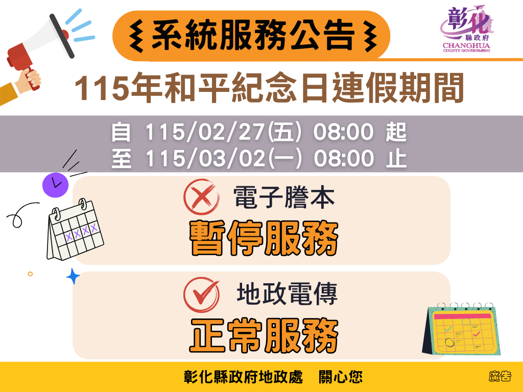公告資訊 115年和平紀念日連假期服務時間公告 發布日期 2026/02/26~2026/03/02 | 發佈單位: 地政處 | 發佈日期: 陳翊倫 7531515分機1515 | 更新日期 2026/02/26 | 瀏覽人數: 7人 《置頂》 電子謄本:115/2/27(五)08:00-115/3/2(一)08:00暫停服務。 地政電傳:正常服務。