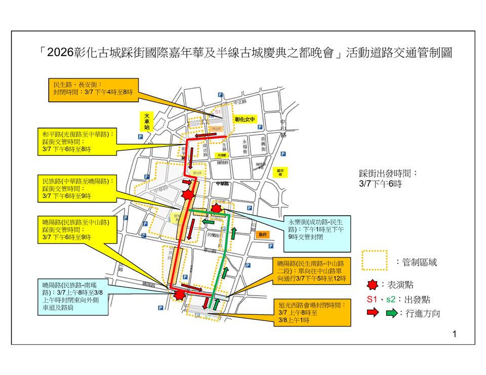 公告資訊 「2026彰化古城踩街國際嘉年華及半線古城慶典之都晚會」活動道路管制公告,請民眾多加留意 發布日期 2026/02/26~2026/03/26 | 發佈單位: 地政處 | 發佈日期: 陳翊倫 7531515分機1515 | 更新日期 2026/02/26 | 瀏覽人數: 18人 「2026彰化古城踩街國際嘉年華及半線古城慶典之都晚會」活動公告 一、活動時間:115年3月7日(星期六)上午8時至115年3月8日(星期日)上午1時。 二、活動周邊道路管制,活動期間將封閉本市部分道路,請配合改道行駛,活動期間管制路段詳公告。 三、活動期間,周邊人行道(光復路、民生路、旭光西路、中山路二段)暫時開放停放機慢車,請配合現場指揮人員停放。